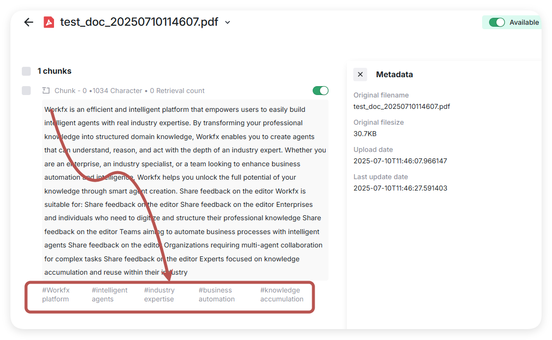 After enabling enhancing mode, you can see the extracted keywords for each chunk in the document interface.