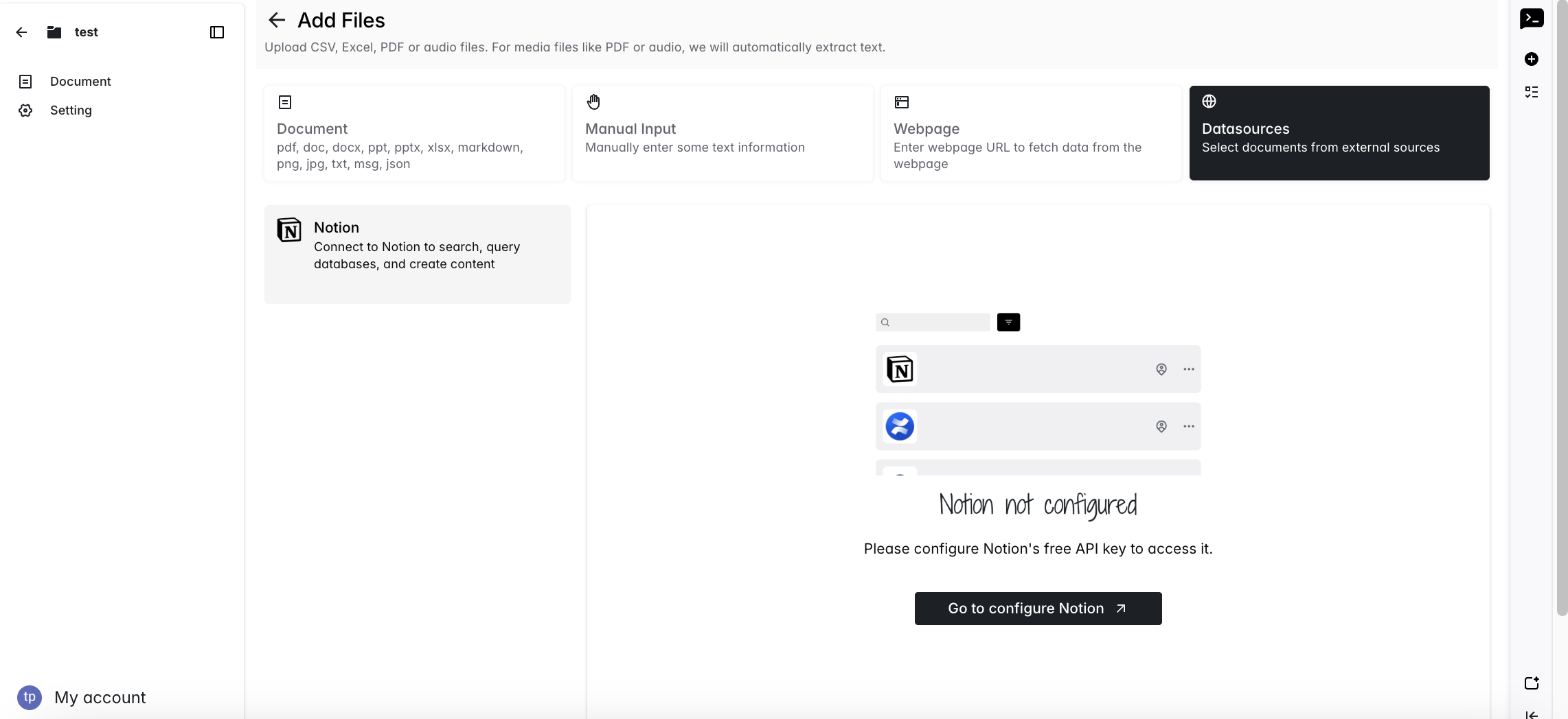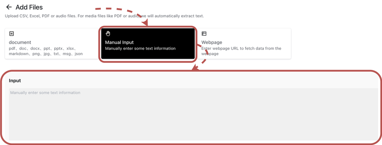 Document You can upload your local file here. Currently, we support the following formats: PDF, DOC, DOCX, PPT, PPTX, XLSX, Markdown, PNG, JPG, TXT, MSG, JSON.