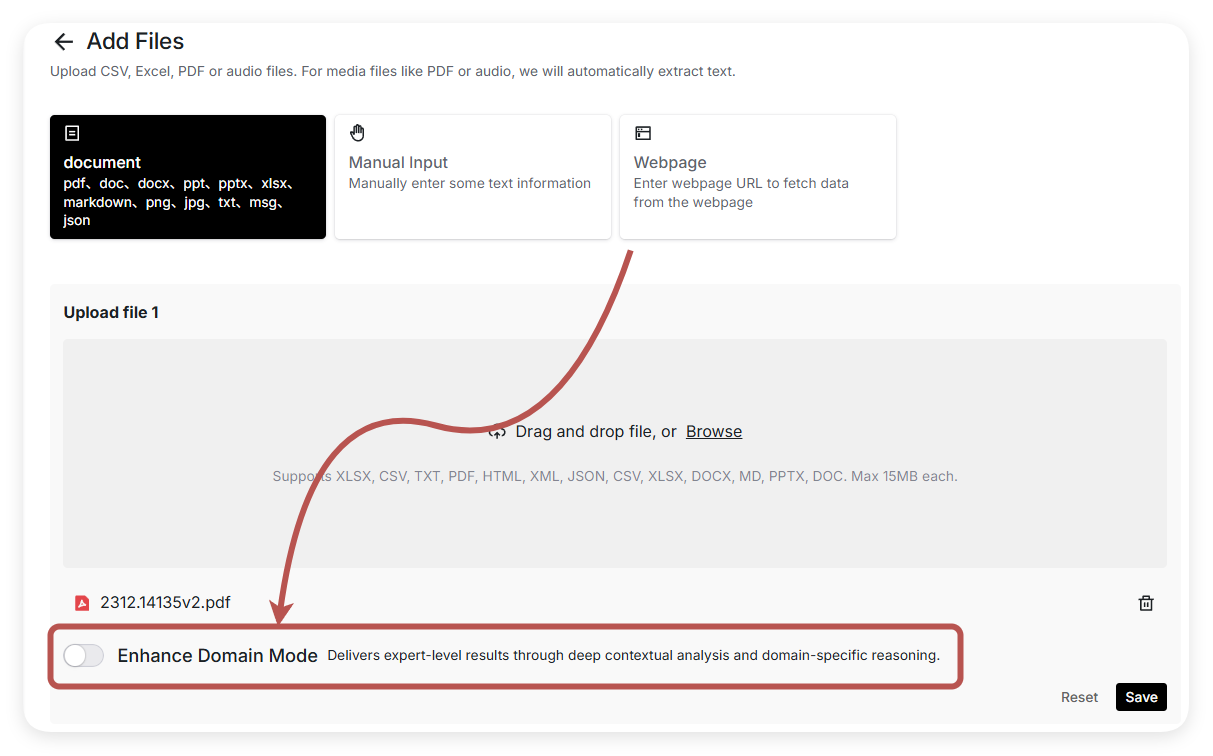When creating a new knowledge, you have the option to enable Enhanced Domain Mode for advanced retrieval capabilities.
