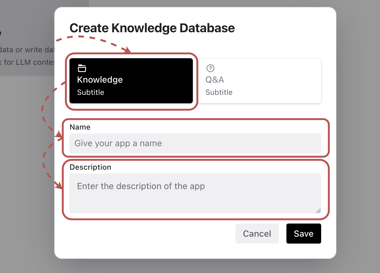 In the "Name" field, you need to give your knowledge database a name. This helps identify it later when used by agents or apps.