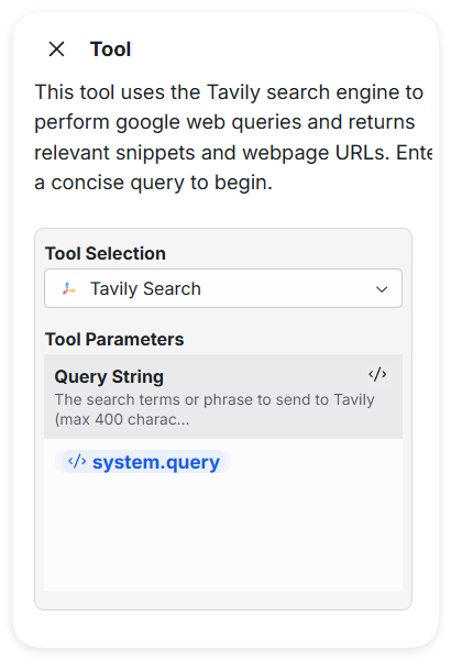 Both built-in tools—Serp Google Search and Tavily Search—only require the user's input query to be passed in directly, without any additional processing or variable transformation.