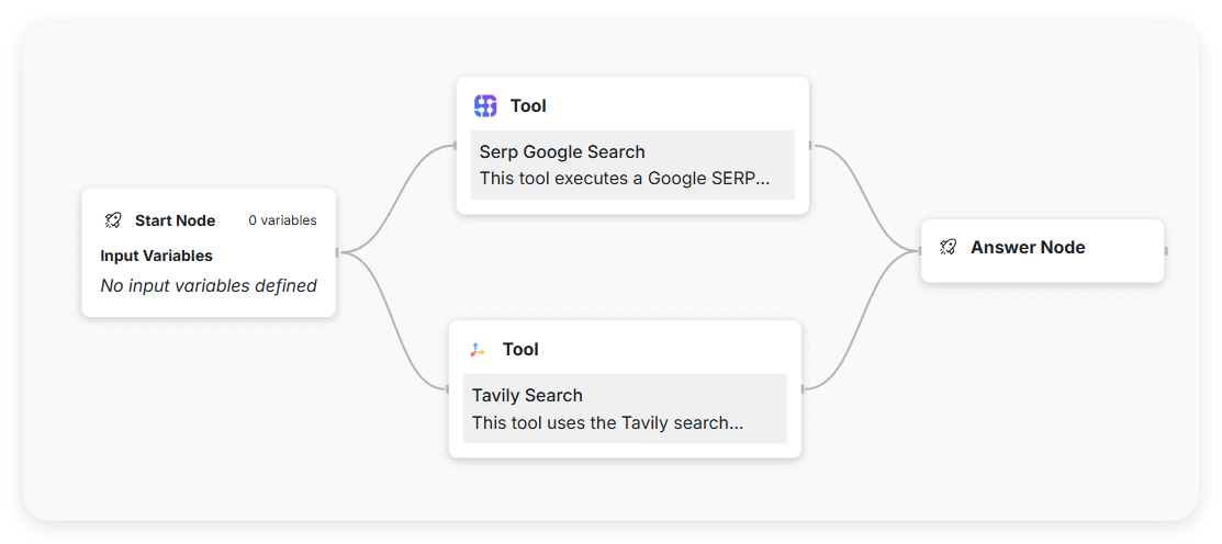 The End Node receives results from both the Serp and Tavily search tools and combines them into a single unified output for the user.