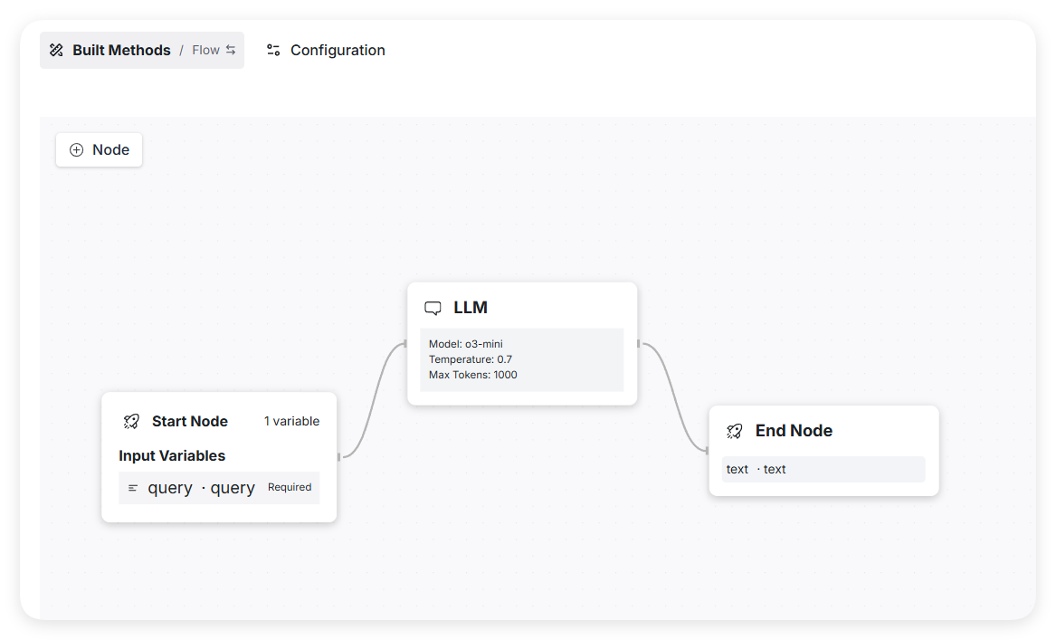 The configuration of the LLM node is shown above. Users are free to customize it to enable more complex functionalities; this setup is for demonstration purposes only. The blue text indicates a reference to the query from the start node, which serves as the default input for the tool.