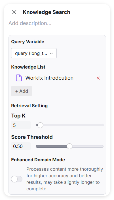 Knowledge Selection: Choose one or more knowledge sources to define the search scope. In this example, the WorkFX introduction document is selected.