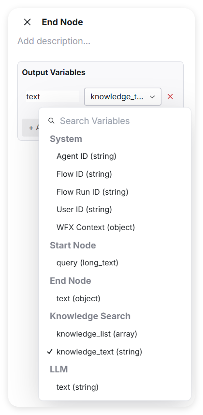 In the End Node, select the text output from the Knowledge Search node as the final output