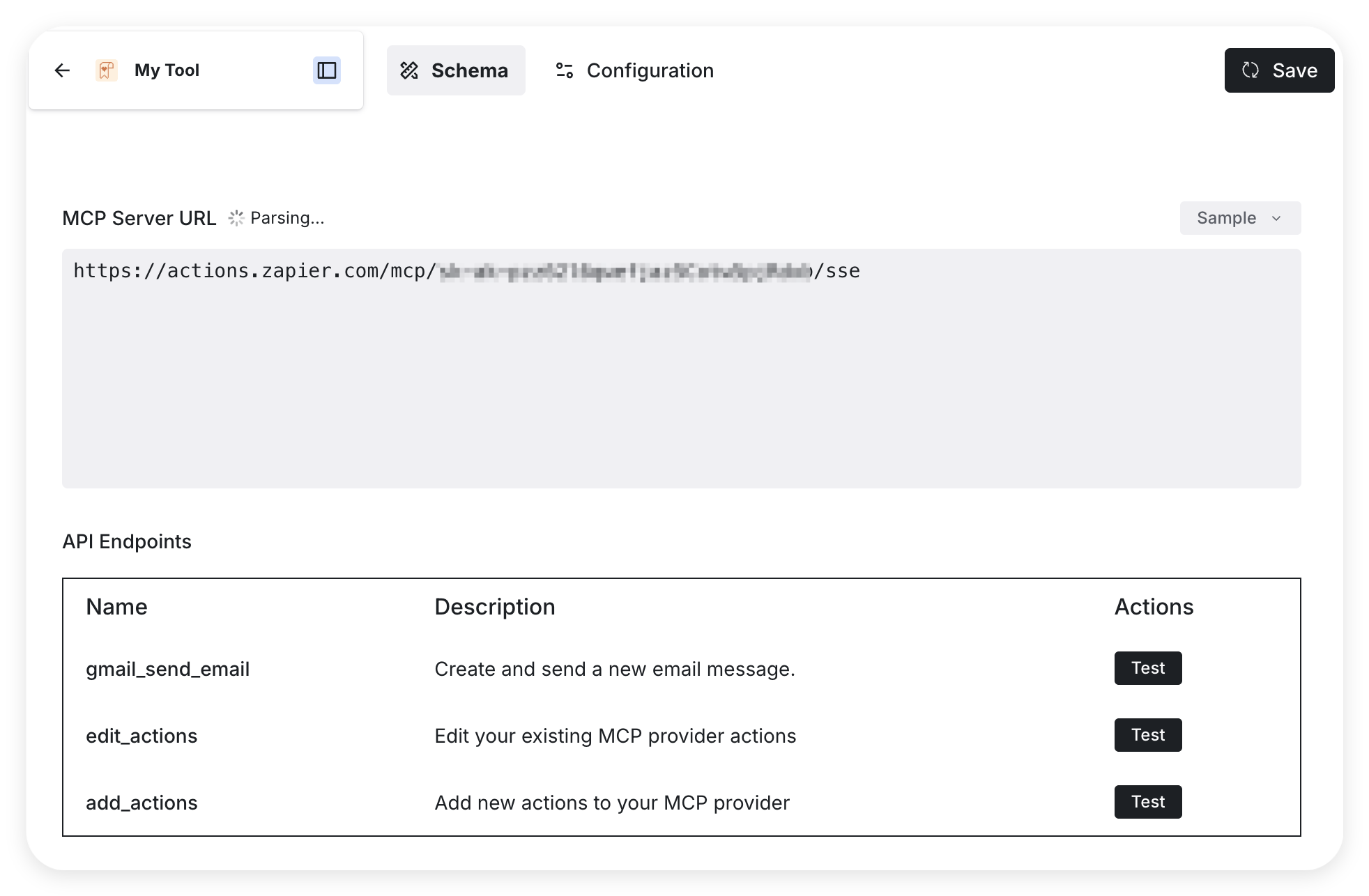 After the creation is completed, you will be redirected to the configuration page of this MCP tool. You can always open this page again by selecting the MCP tool from the tool list. Here you can: