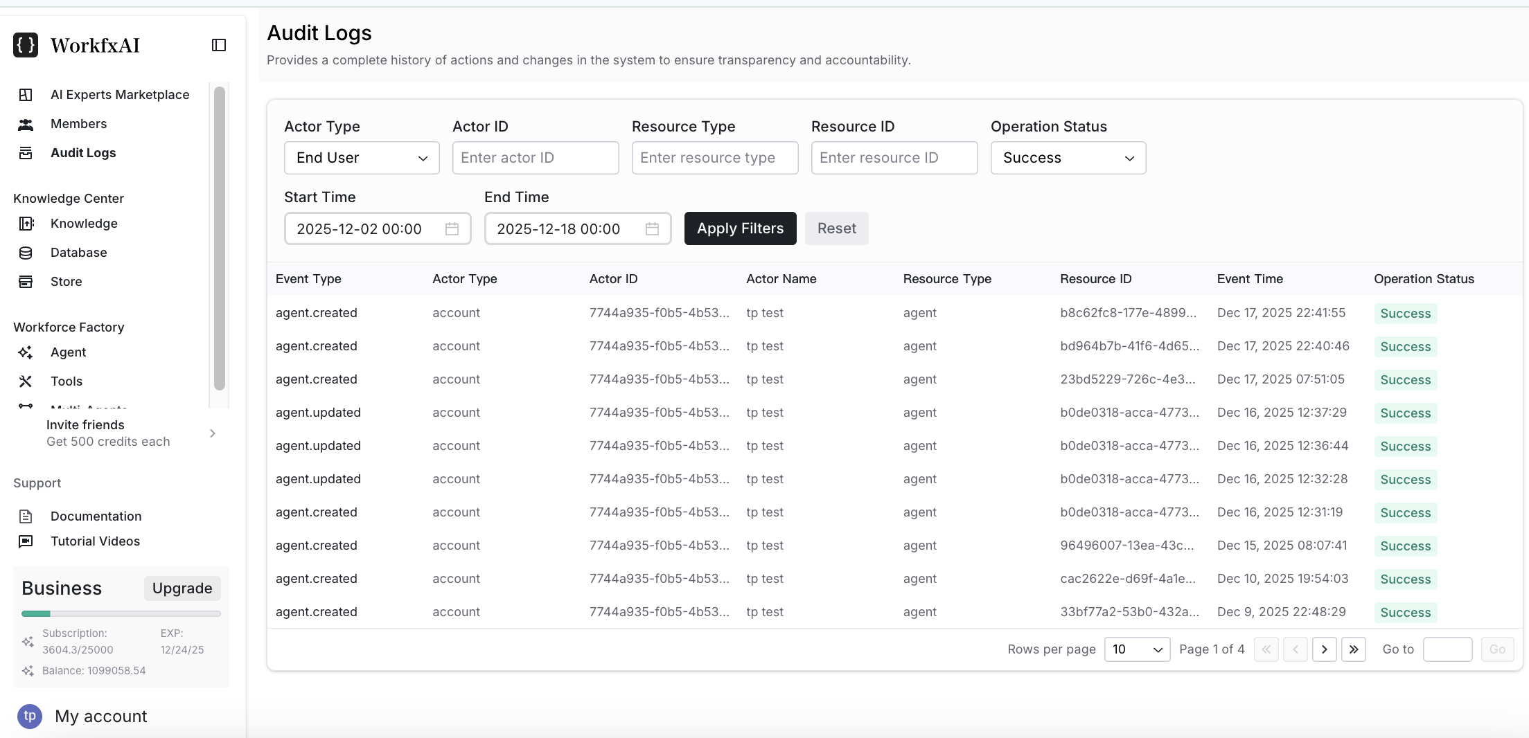 The Audit Logs page shows a history of actions and changes in the system. You can use filters to locate specific events by actor, resource, time range, and status.